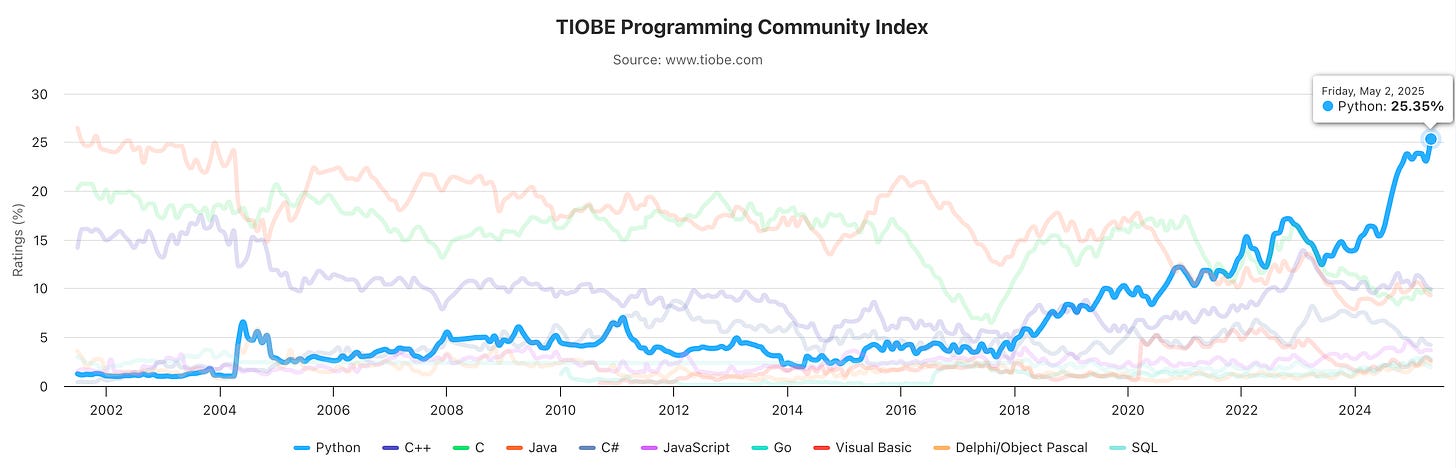 2025年 TIOBE 指数记录。(https://www.tiobe.com/tiobe-index/)