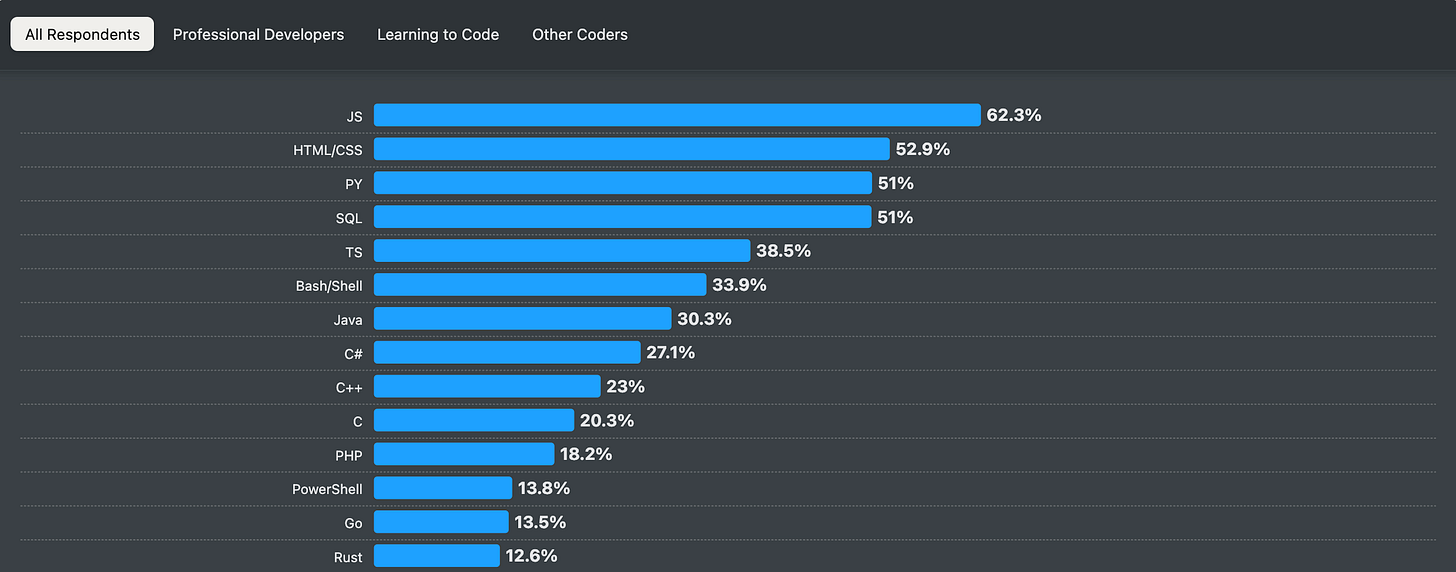 随着越来越多的公司使用人工智能进行构建,寻找在驱动人工智能的技术(包括精通 Python)方面经验丰富的开发人员,就变得理所当然了。这是来自 2024 年 StackOverflow 开发者调查的另一张图表,再次印证了上述观点。