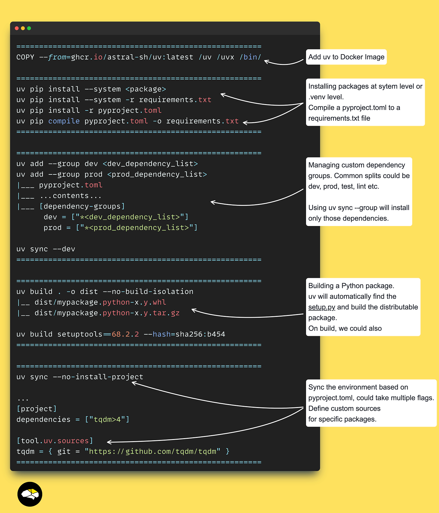 以下是 UV 提供的命令和功能列表,涵盖多种用例,从在 Dockerfile 内部使用,到为你的包构建可分发的 wheel (.whl) 文件,或在 [dev]、[prod] 或 test 中分离依赖组。